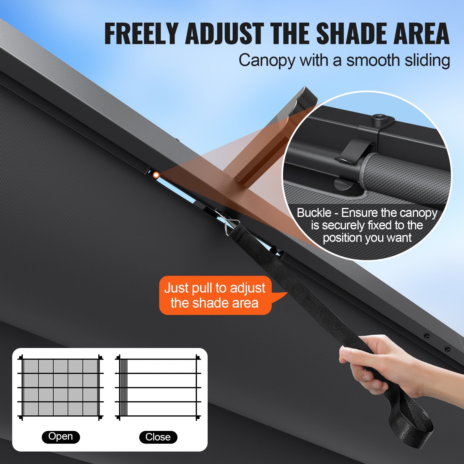 Verstellbares Vordach: Ausgestattet mit einem verstellbaren, einziehbaren Schirm und integriertem Gleitschienendesign können Sie die Schirmfläche ganz einfach nach Bedarf anpassen. Ob Sie Schatten an glühend heißen Tagen oder Schutz bei leichtem Regen benötigen, diese Pergola bietet Ihnen höchsten Komfort und ermöglicht Ihnen die perfekte Balance zwischen Sonne und Schatten.