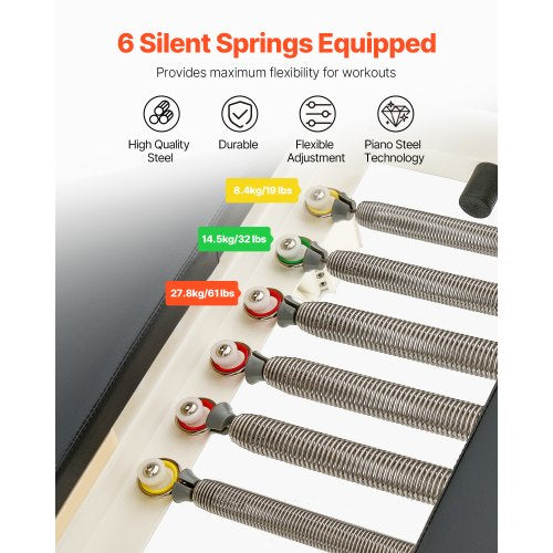 Premium-Federn: Dieses Pilates-Heimgerät verwendet hochwertige importierte Klavierstahlfedern und bietet 6 Federwiderstandsstufen zum Training der Oberkörper-, Unterkörper- und Rumpfmuskulatur. Das Set enthält 3 starke Federn (rot), 1 mittlere Feder (grün) und 2 leichte Federn (gelb).