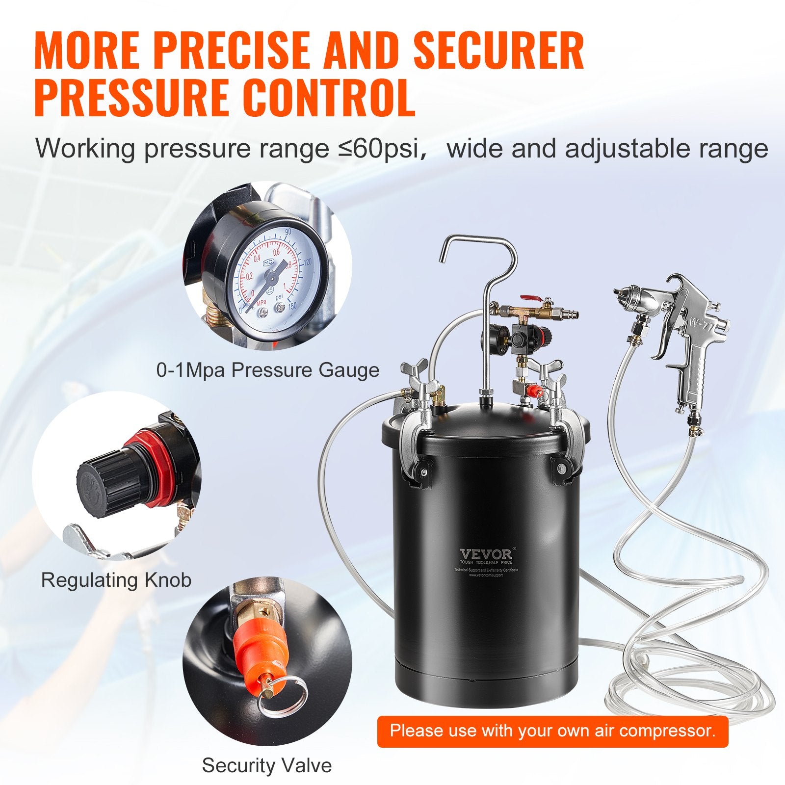 Einstellbarer Druck: Der Druck des Farbbehälters ist einstellbar, Arbeitsdruck ≤ 60 psi. Sie können ihn präzise per Druckknopf einstellen, und das präzise Manometer zeigt den Druck in Echtzeit an. Das Sicherheitsventil unseres Druckbehälters zum Lackieren lässt den Druck automatisch ab, wenn er 0,5 MPa überschreitet, um einen sicheren Betrieb zu gewährleisten. Hinweis: Verwenden Sie Ihren eigenen Luftkompressor.