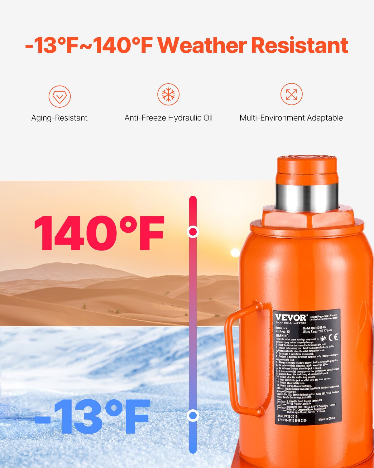 Auslaufsicheres Design: Dieser Hydraulikheber verfügt über industrielle Präzisionsschweißungen und abgedichtete Anschlüsse, um Leckagen zu vermeiden. Er ist für den Einsatz bei jedem Wetter mit einem Temperaturbereich von -25 °C bis 60 °C ausgelegt. Dies gewährleistet zuverlässige Leistung und reduziert das Risiko der Alterung von Teilen und des Einfrierens des Hydrauliköls.
