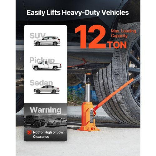 Stabil lyftning: Vår hydrauliska flaskdomkraft hanterar upp till 12 ton (26 455,5 lbs), perfekt för sedaner, pickuper, stadsjeepar, små dragbara husbilar och minibussar. Den är idealisk för däckbyten, snabba inspektioner och till och med lyft av jordbruksutrustning och byggmaskiner.
