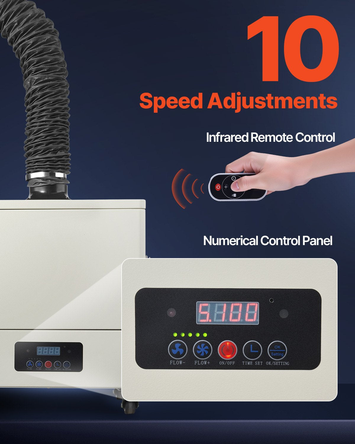 10-stufige Geschwindigkeiten mit Fernbedienung: Mit 10 einstellbaren Stufen können Sie die Absauggeschwindigkeit bequem über das Bedienfeld oder die Infrarot-Fernbedienung steuern. Passen Sie die Saugleistung an die Rauchentwicklung in Ihrem Arbeitsbereich an, verbessern Sie die Effizienz und schaffen Sie eine sauberere Umgebung.