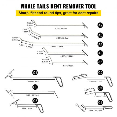 21-teilige Dellenentfernungsstangen: Enthält 21 Dellenzieherstangen in verschiedenen Größen (A2-A6, B2-B11, C1-C6). Dieses Stangenset besteht aus langen Stangen mit unterschiedlich geformten Spitzen. Die Längen reichen von 2,2 bis 81 cm. Besonders geeignet für Autodellen in tiefen Bereichen, die mit unseren Händen nicht erreichbar sind.