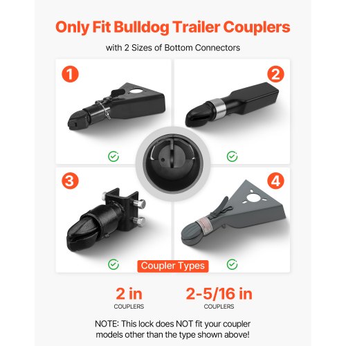 Passend für 2 Kupplungsgrößen: Dieses Kupplungsschloss passt für 2" (50,6 mm) und 2-5/16" (58,6 mm) Bulldog-Kupplungen und bietet Sicherheit für Ihr Wohnmobil oder Ihren Anhänger. Hinweis: Bitte überprüfen Sie die Kupplungsgröße vor dem Kauf.