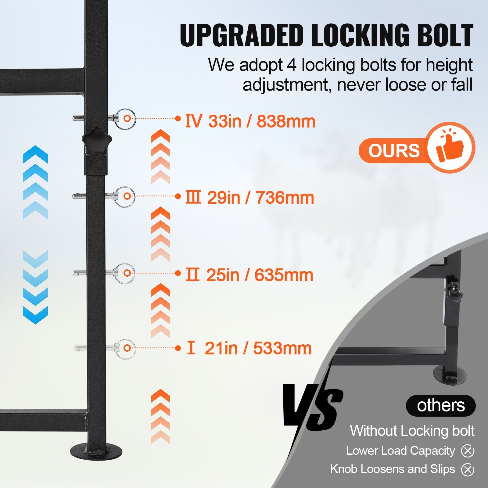 4-stufige Höhenverstellung: Das einzigartige Stiftdesign bietet vier einstellbare Höhenoptionen von 53,3 cm bis 84,8 cm, um Tieren unterschiedlicher Größe gerecht zu werden. Verstärkte Pfosten mit dreieckigem Rahmen verbessern die Tragfähigkeit und sorgen für Sicherheit und Stabilität.