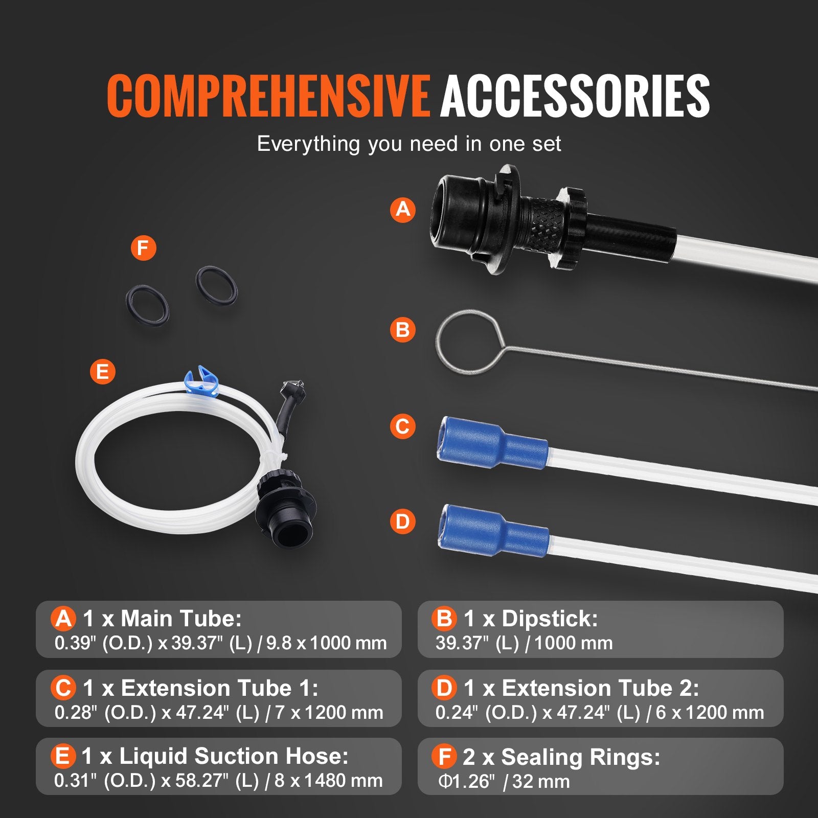 Gründliche Flüssigkeitsabsaugung: Mit Ölabsaugrohren in vier Größen erreichen Sie die tiefsten Tiefen und halten Ihre Tanks trocken. Hauptrohr: 9,8" x 39,37" / 249 x 1000 mm; Verlängerungsrohr 1: 0,28" x 47,24" / 7 x 1200 mm; Verlängerungsrohr 2: 0,24" x 47,24" / 6 x 1200 mm; Saugschlauch: 0,31" x 58,27" / 8 x 1480 mm.