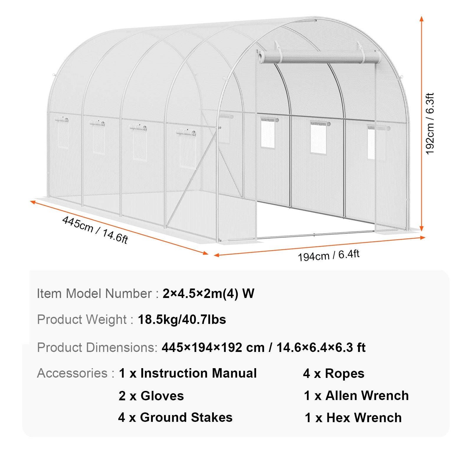 Begehbares Tunnelgewächshaus 14,6x6,36x6,3ft Verzinkter Rahmen PE-Abdeckung Weiß
