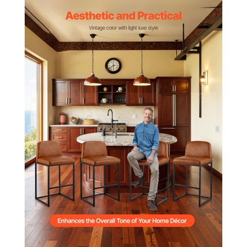 Lätt lyx och mångsidighet: Det vintagebruna PU-lädret i kombination med det strömlinjeformade, böjda ryggstödet, lämpligt för både hem och kommersiella utrymmen. Standardsitthöjden passar olika vanliga bardiskar och köksöar.