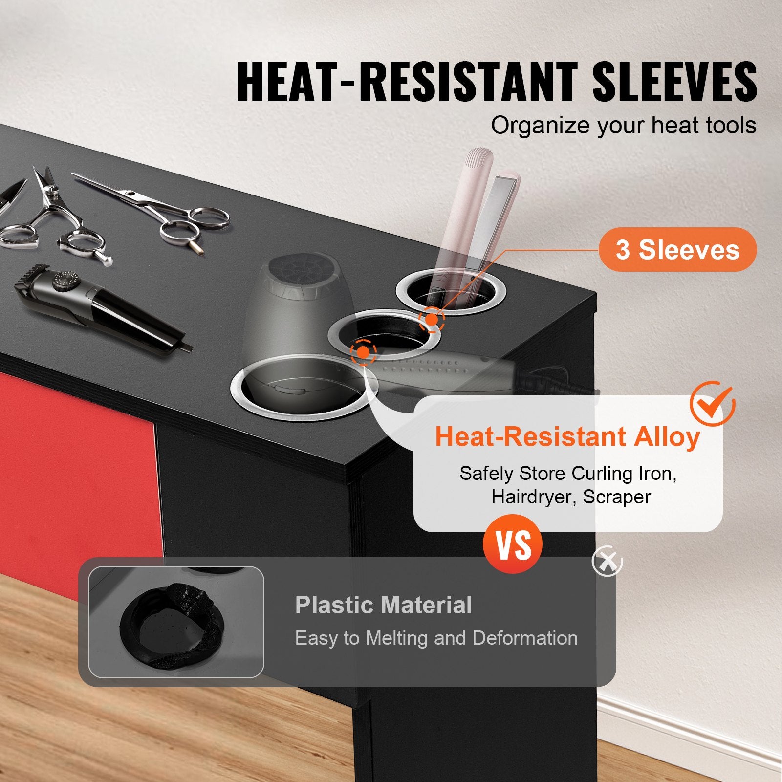 Hitzebeständige Werkzeughüllen: Die Friseurstation besteht aus hitzebeständigem Legierungsmaterial und verfügt über drei Hitzewerkzeughüllen mit einem Bodenschutzdesign, um das Herunterfallen von Werkzeugen zu verhindern und so die Sicherheit während der Verwendung zu gewährleisten.