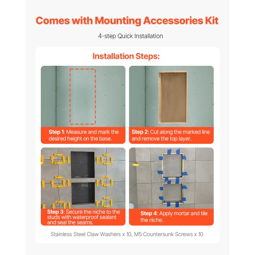 Einfache Montage: Mit Zubehörset für horizontalen oder vertikalen Einbau. So einfach geht's: Schritt 1: Gewünschte Höhe bestimmen und waagerecht auf den Unterboden ziehen. Schritt 2: Entlang der Linie schneiden und den oberen Unterboden entfernen. Schritt 3: Nische mit wasserfester Spachtelmasse an den Balken befestigen und Fugen abdichten. Schritt 4: Mörtel auftragen und ausgewählte Fliesen anbringen.