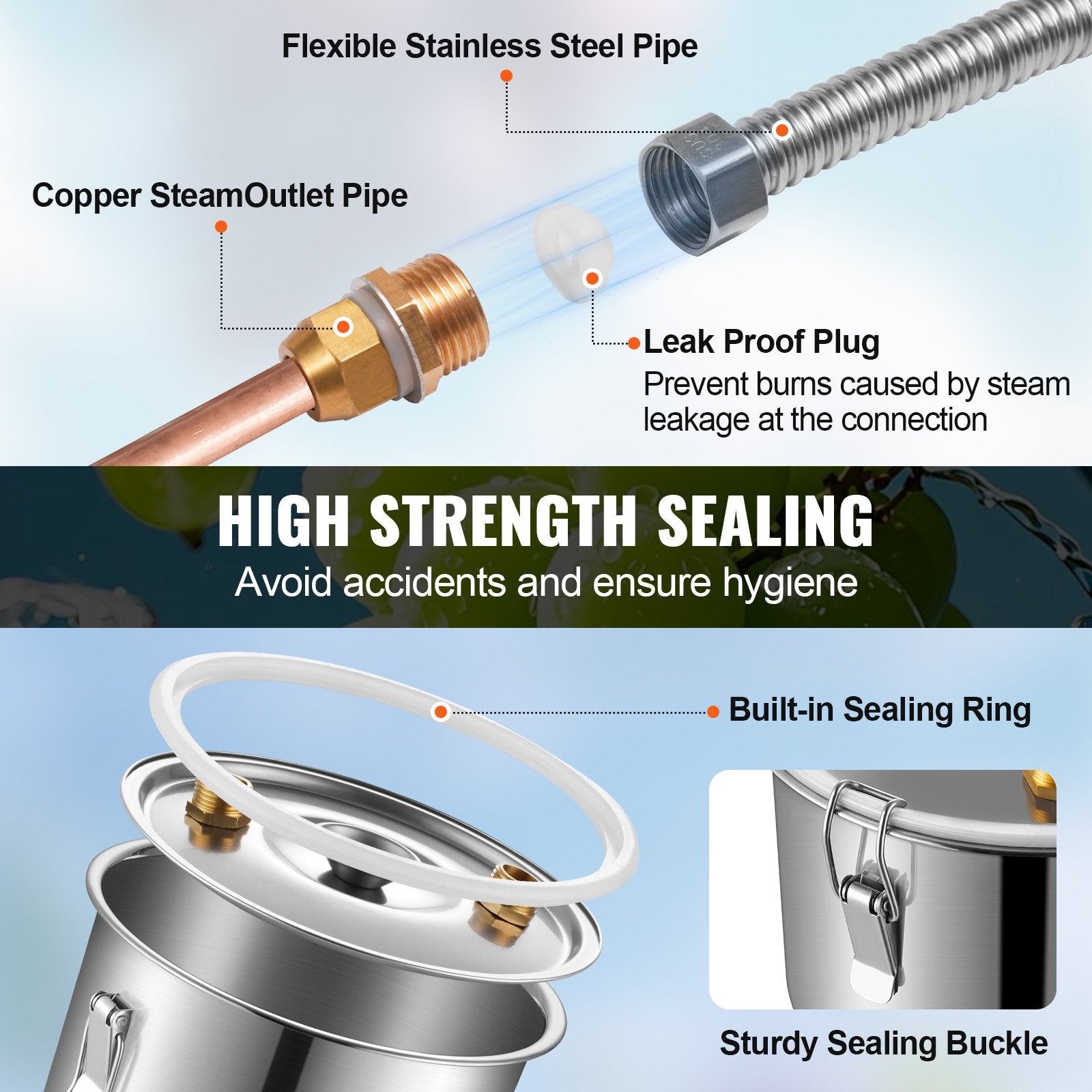 Sicheres Gären und Heizen: Das Gärfass ist bequem zu handhaben. Ein Einweg-Auslassventil lässt die während der Gärung entstehenden Gase ab und reduziert so den Innendruck. Der verdickte Edelstahlboden ist mit verschiedenen Heizmethoden wie Holzfeuer, Gasherden und Gasöfen kompatibel und verhindert Verformungen und Beschädigungen. Die Temperaturanzeige am Deckel zeigt Celsius und Fahrenheit an und erleichtert so die Temperaturkontrolle während der Destillation.