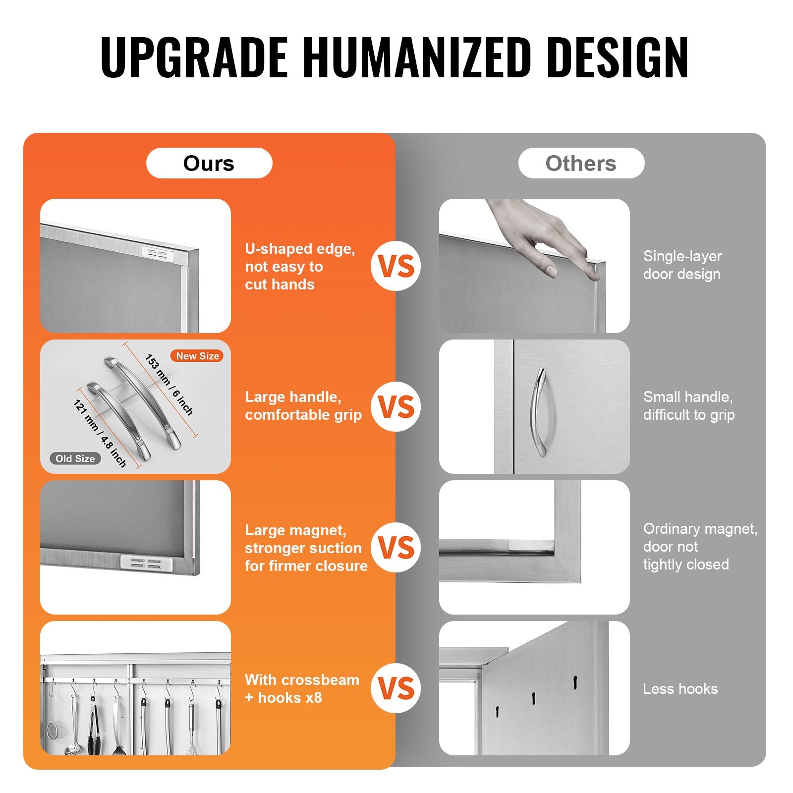Präzisionsöffnung: Gesamtmaße: 990 x 660 x 45 mm (39 x 26 x 2 Zoll), Einbaumaß: 905 x 575 mm (36 x 23 Zoll). Für eine bessere Funktion empfehlen wir, zusätzlich 2 mm Spielraum einzuplanen. Die Tür wurde speziell für Außenküchen und Grillinseln entwickelt und verleiht Ihrem Kochbereich eine elegante Note. Dank der präzisen Abmessungen ist sie einfach zu verarbeiten, zu montieren und zu demontieren. Erhältlich in verschiedenen Größen und Ausführungen, eignet sie sich perfekt für Innen- und Außenküchen sowie alle anderen Wetterbedingungen im Freien.