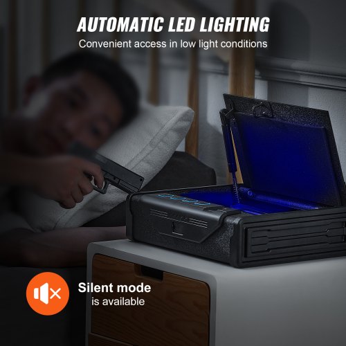 LED-Licht und Lautlosmodus: Unsere Waffenbox wurde speziell für Ihre Bedürfnisse entwickelt und verfügt über eine LED-Beleuchtung für einfachen Zugriff auch nachts. Der Lautlosmodus ermöglicht Ihnen die diskrete Entnahme Ihrer Gegenstände, ohne andere zu stören.