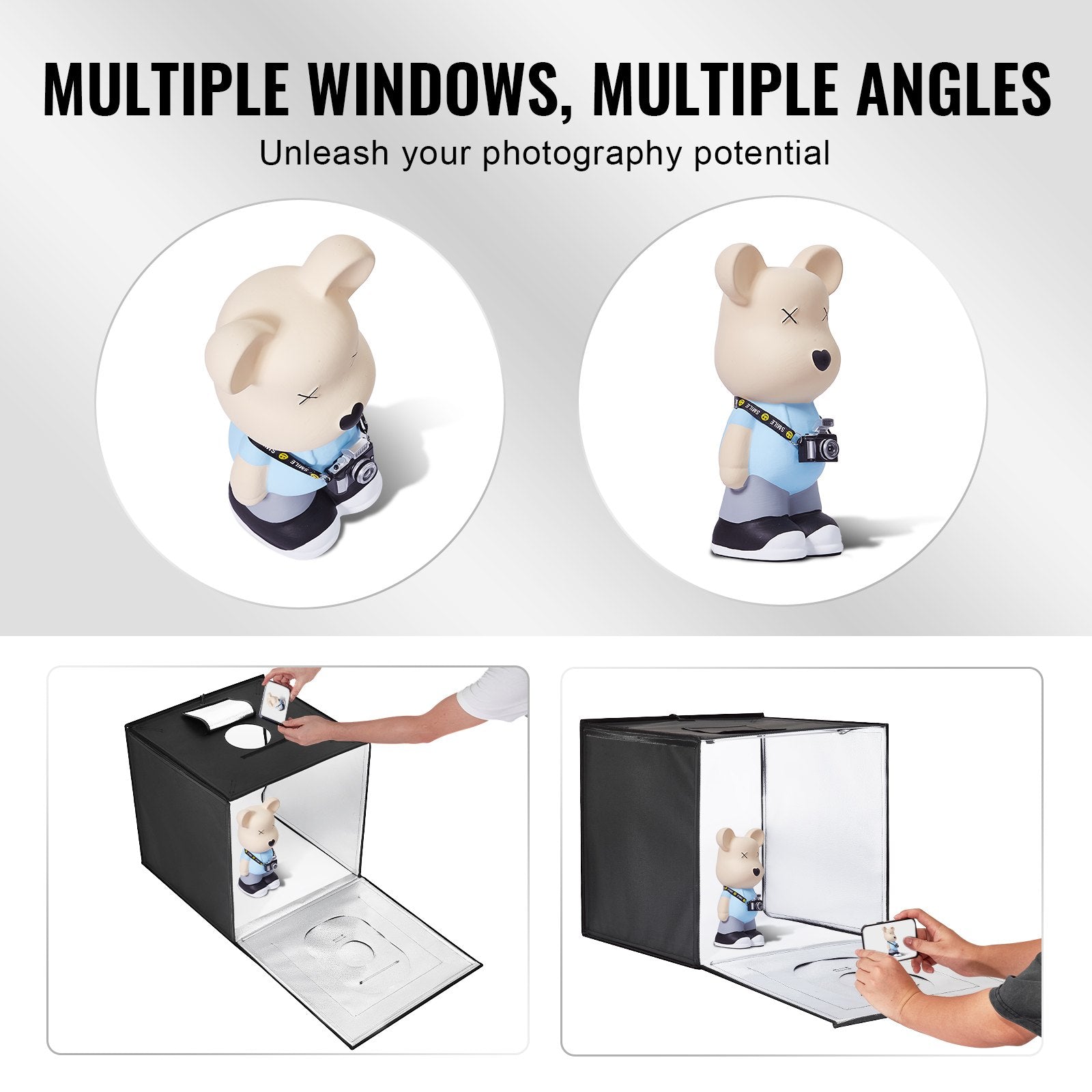 Fotografie aus verschiedenen Perspektiven: Entdecken Sie mit unserer Foto-Leuchtbox unzählige Perspektiven. Dank mehrerer Öffnungen können Sie aus allen Perspektiven fotografieren. Eine praktische Öffnung an der Oberseite erleichtert Aufnahmen von oben und sorgt für Flexibilität und ein noch besseres Fotoerlebnis.