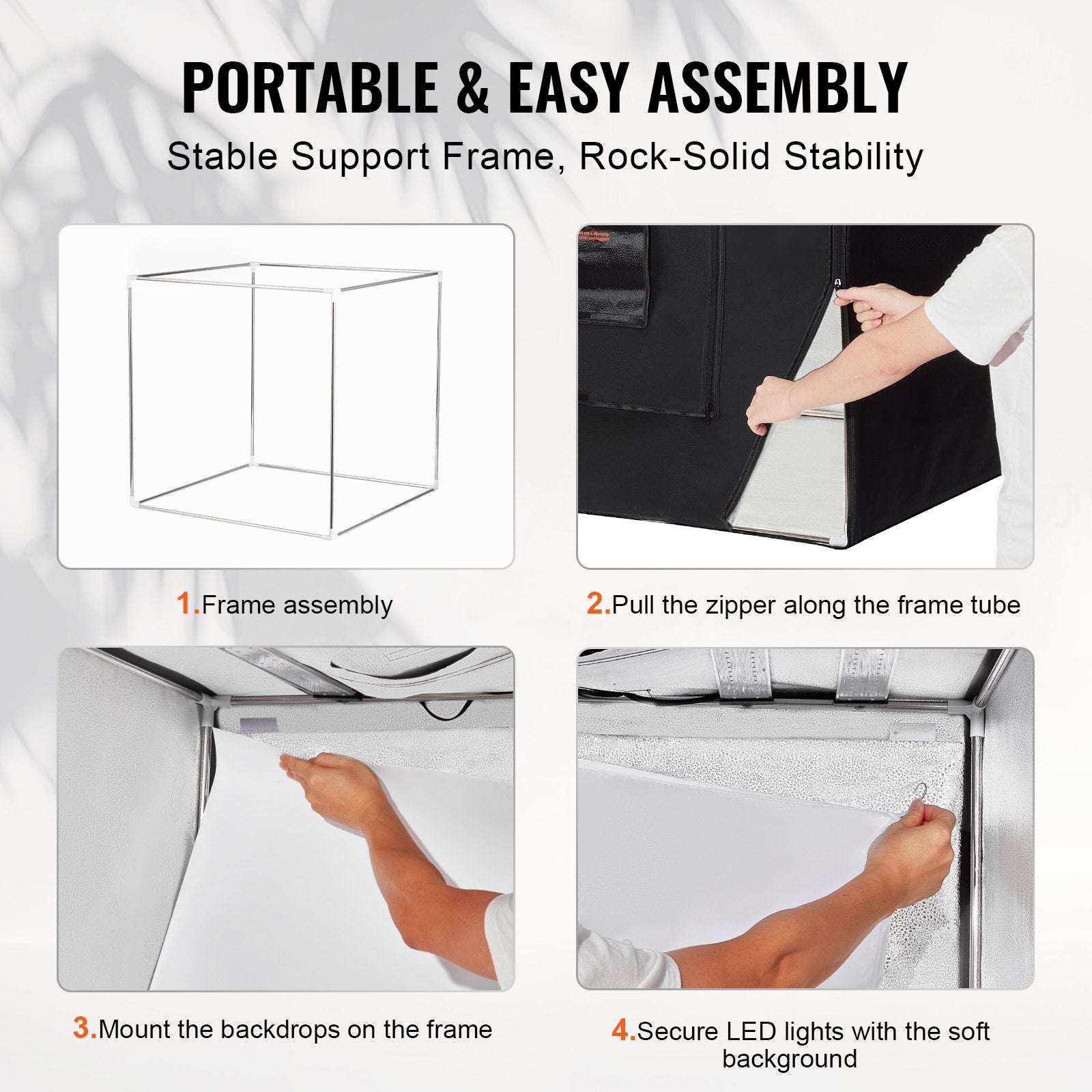 Stabiler Rahmen, einfache Montage: Unsere Foto-Leuchtbox verfügt über eine stabile Rahmenstruktur für einfache Installation und kompakte Lagerung. Entwickelt ohne komplexe Beleuchtungsanordnungen. Komplett mit einer Vliesstoff-Tragetasche für einfachen Transport ist unsere Leuchtbox perfekt für professionelle Fotos – jederzeit und überall.
