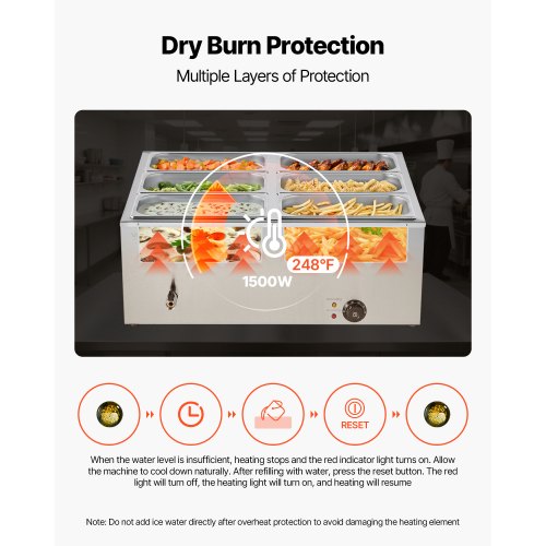 Smart-Stopp-Funktion: Wenn die Temperatur 120 °C überschreitet, stoppt der Speisenwärmer automatisch. Um ihn wieder zu verwenden, füllen Sie ihn mit Wasser und drücken Sie die Reset-Taste. Vermeiden Sie das Einfüllen von eiskaltem Wasser, da dies das Heizrohr beschädigen kann.