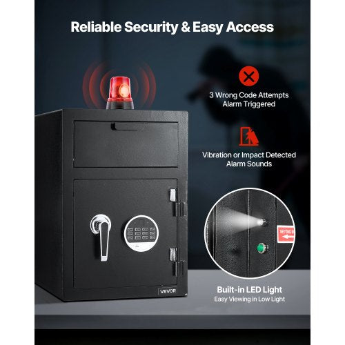 Kassaskåp med öppning på 0,6 liter: Det främre öppningsfacket möjliggör snabb inlämning av kontanter och dokument utan att öppna kassaskåpet. Rymlig kapacitet på 0,6 liter rymmer kontanter, checkar, filer, smycken och mer – perfekt för hem, småföretag och kontor.