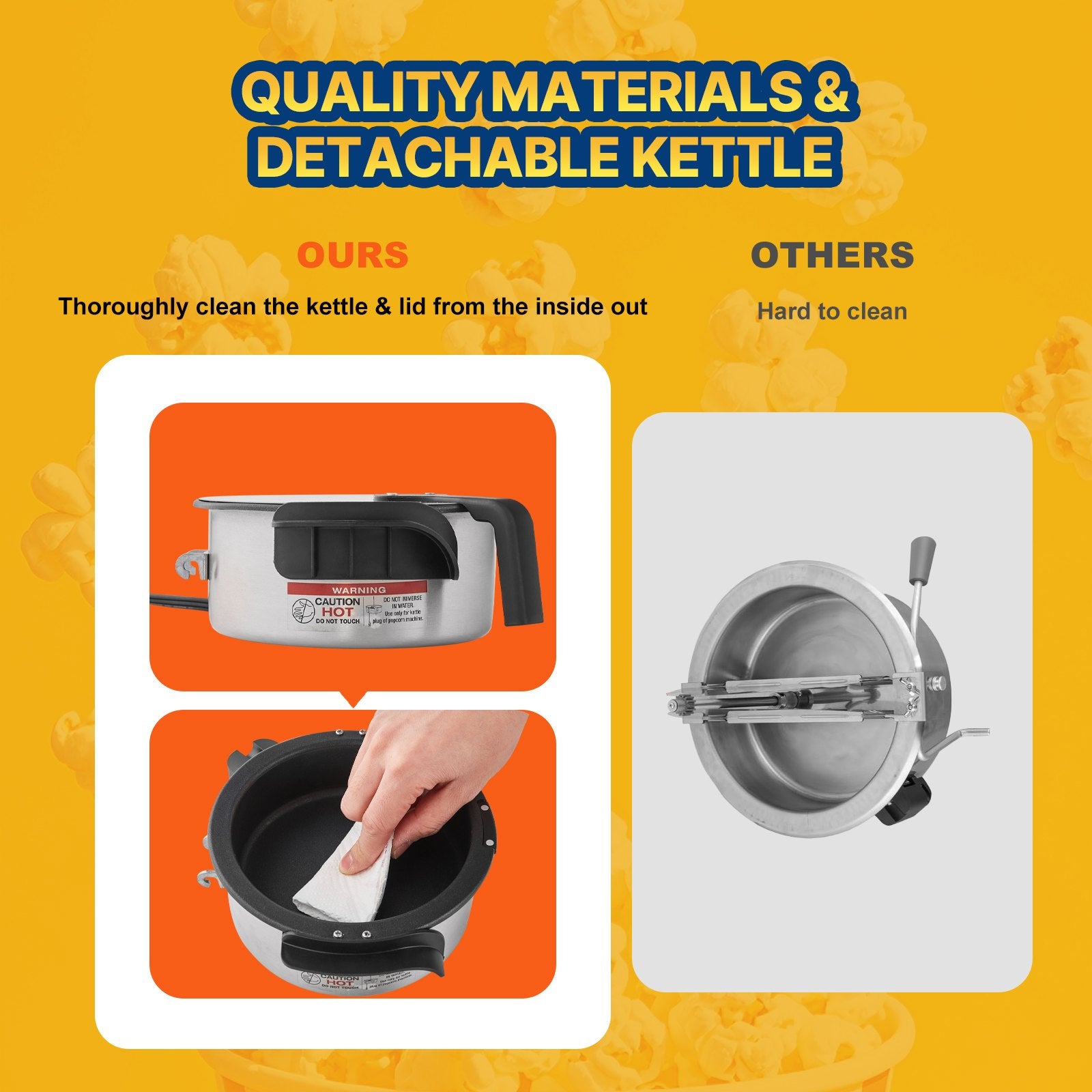 Hohe Leistung für kleine Geräte: Diese kommerzielle Popcornmaschine hat ein Fassungsvermögen von 113 ml und kann 1,5 Liter Popcorn pro Ladung produzieren – ideal für vielbeschäftigte Familien. Der Kessel heizt sich in wenigen Minuten auf und ist bereit, Sportfans, Festivalbesucher und Partygäste mit reichlich Popcorn zu verwöhnen.