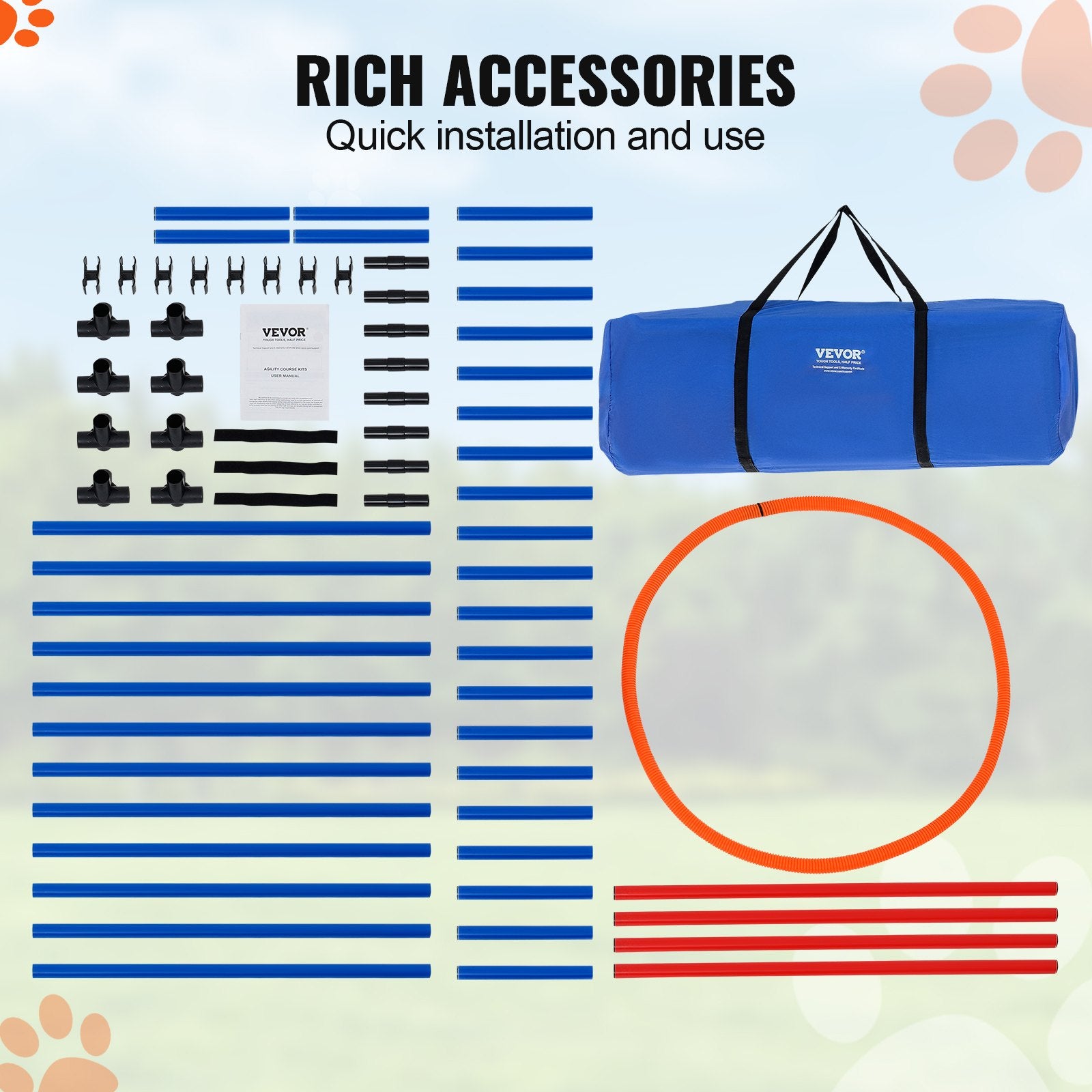 Lieferumfang: 1 x Bedienungsanleitung; 8 x Vierwegeverbinder; 8 x gerade Verbinder; 3 x Klettbänder; 8 x Stangenklemmen; 1 x Stangenaufbewahrungstasche; 1 x Biegering; 8 x Basispfosten; 4 x Aktionspfosten; 16 x Erdspieße; 4 x Bodenstützpfosten. Alles, was Sie für ein komplettes Agility-Trainingssetup benötigen – sofort einsatzbereit und mit Spaß.
