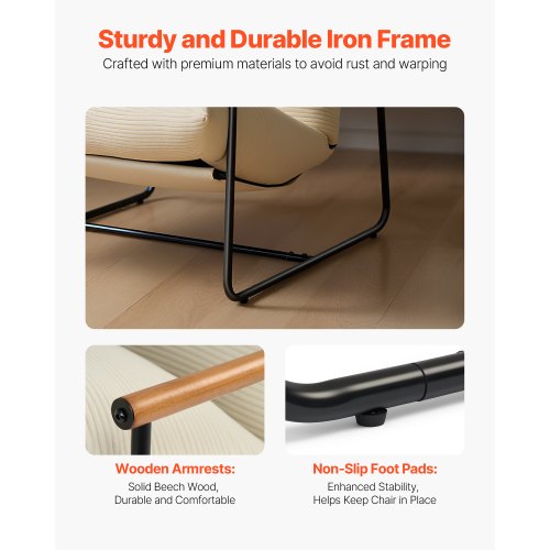 Hållbar ram: Denna moderna accentstol är byggd med en elegant och robust järnram och klarar upp till 135 kg. Dess halkfria benkuddar ökar stabiliteten och förhindrar att golvet repas eller glider.