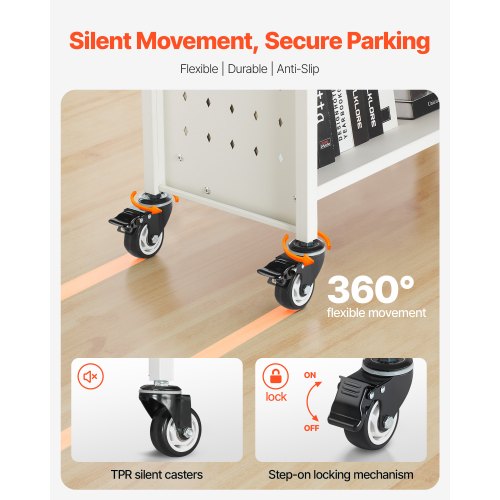 Leise Bewegung: Leise TPR-Rollen gleiten sanft, und zwei verfügen über eine Feststellfunktion für eine sichere Positionierung. Bewegen Sie den Bücherwagen problemlos über Holz- oder Fliesenböden, ohne jemanden zu stören – perfekt für Bibliotheken oder Nachtarbeit.