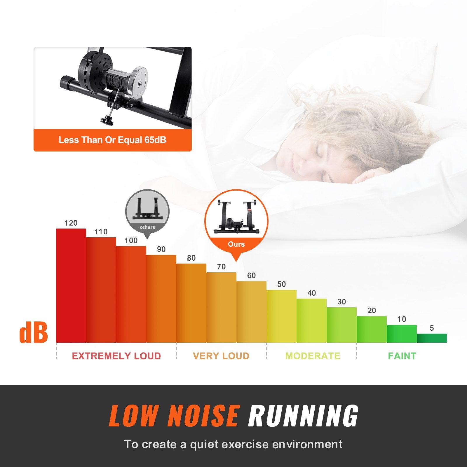 Leiser und reibungsloser Betrieb: Dank des Schwungradmotors wird der Geräuschpegel auf ≤ 65 dB gesenkt, was für ein ruhigeres und angenehmeres Fahrerlebnis mit unserem Indoor-Cycling-Trainingsständer sorgt. Hinweis: Der Geräuschpegel kann je nach Reifenmaterial und Profil variieren. Für den leisesten Betrieb werden Rennräder empfohlen.