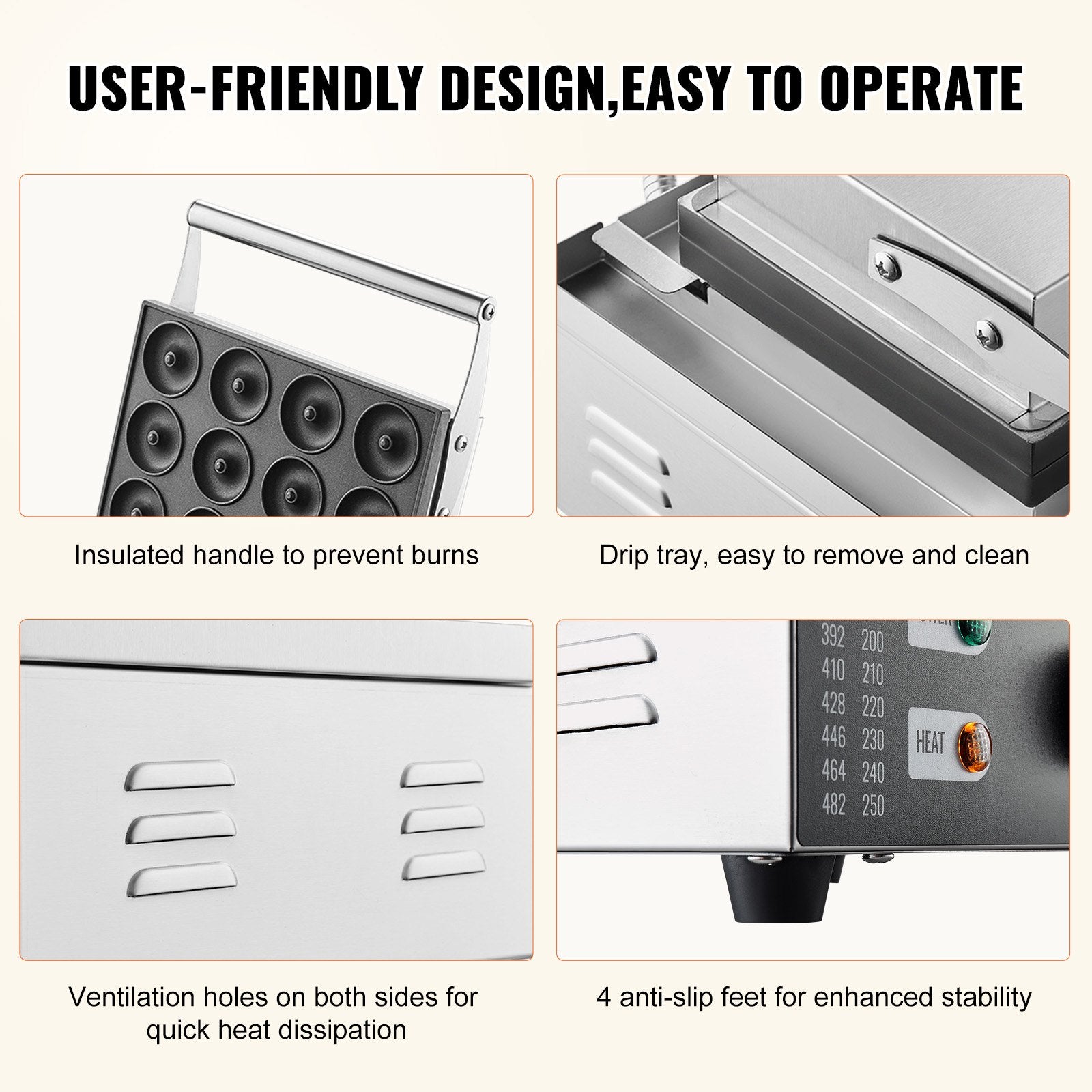 Elektrischer Donutmaker, 1550 W kommerzieller Donutmaker mit Antihaftbeschichtung, doppelseitig beheiztes Waffeleisen mit 12 Löchern für 12 Donuts, Temperatur 50–300 °C, für Restaurants und den Heimgebrauch
