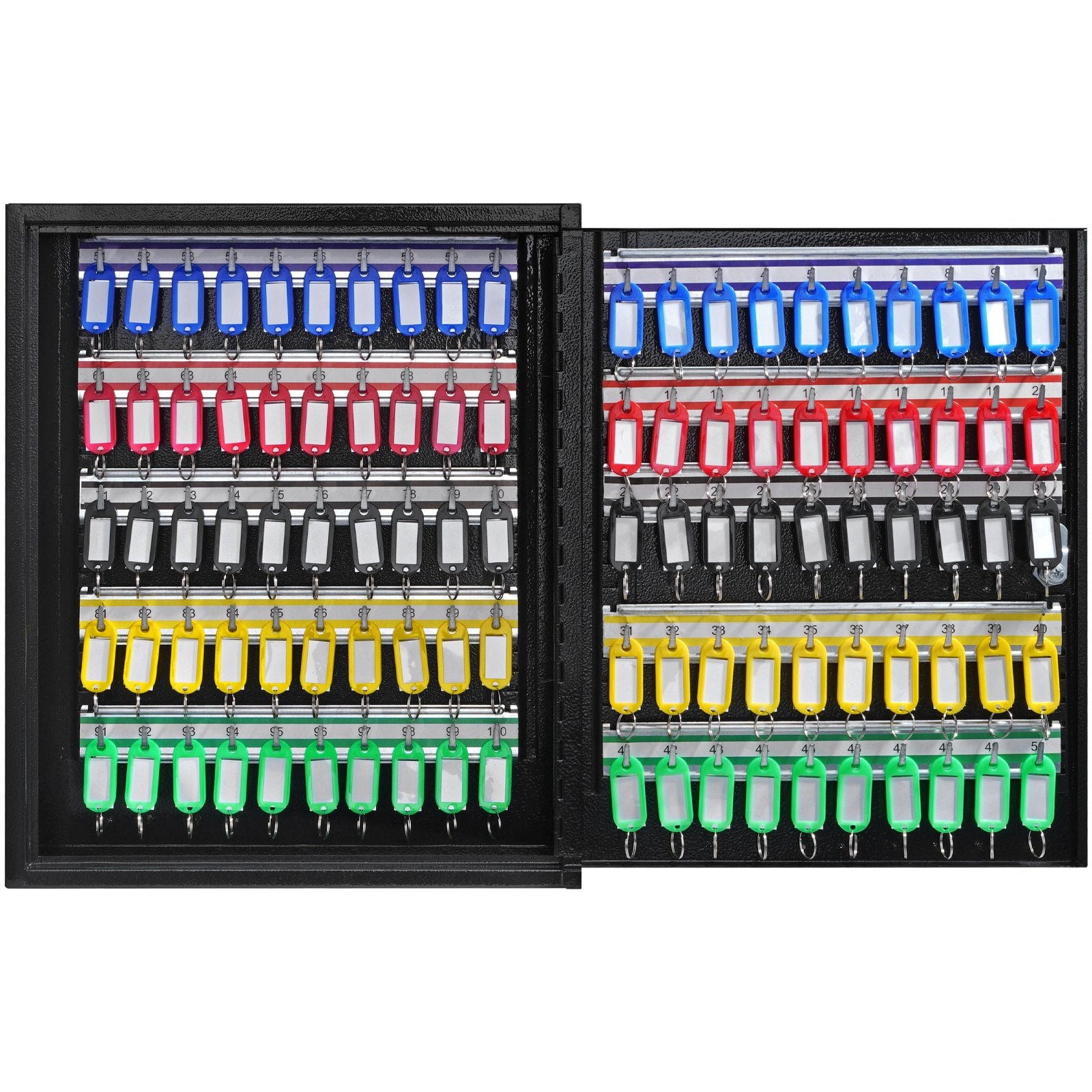 Schlüsselkasten für 100 Schlüssel mit verstellbaren Ablagen und bunten Schlüsselanhängern