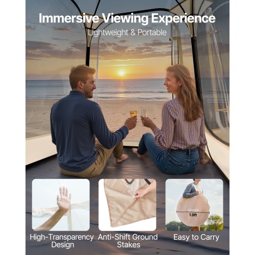 Snabbt uppfällbart på några sekunder: Det genomskinliga sporttältet har en uppfällbar design som möjliggör enkel uppsättning på under en minut – inga komplicerade steg krävs, vilket gör utomhuscamping enklare. Obs: Detta uppfällbara tält är lämpligt för sval höst- och vinterbruk, rekommenderas inte för varmt väder.