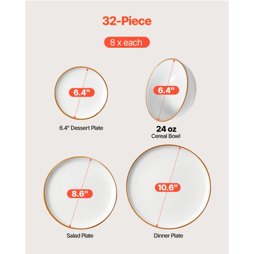 Unverzichtbar für 8-köpfige Familien: Dieses 32-teilige Geschirrset umfasst Schüsseln (20 x 17 cm), Salatteller (20 x 21 cm), Speiseteller (20 x 28 cm) und Dessertteller (20 x 17 cm) und eignet sich perfekt für alltägliche Mahlzeiten und Zusammenkünfte. Es eignet sich auch hervorragend als Einweihungsgeschenk.