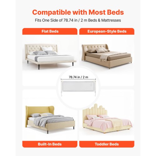Passar de flesta sängar: Höjden kan justeras upp till 210 mm och passar en sängsida upp till 2 m. Kompatibel med madrasstjocklekar från 5–27 cm. Fungerar med massiva träramar, barnsängar, plattforms-/platta botten, madrasser och andra sängar.