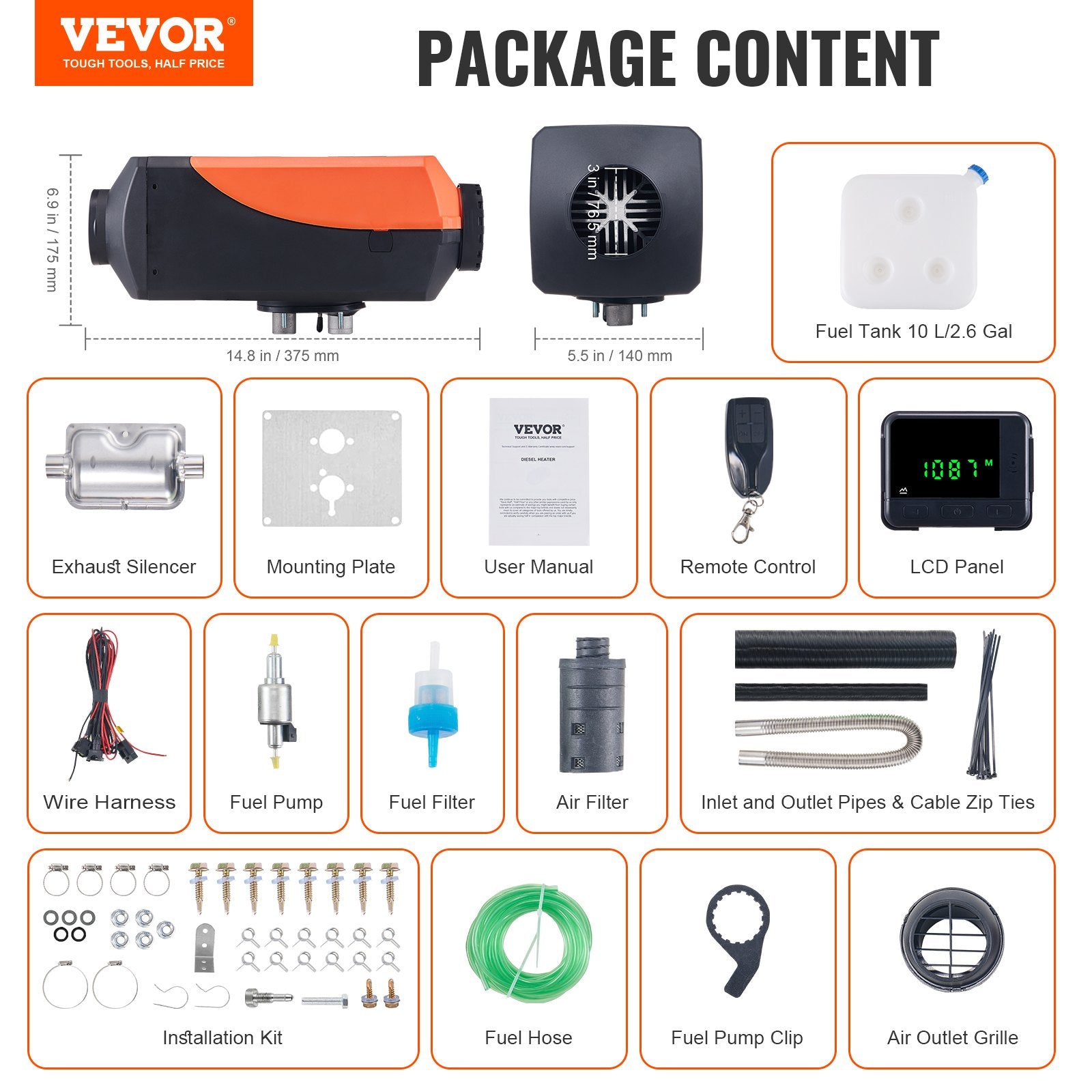 Effiziente Heizung: Heizleistung: 8 kW; Nennspannung: 12 V und 24 V. Anwendungsbereich: 20–25 m². Der Diesel-Lufterhitzer von VEVOR verwendet einen sandgestrahlten Aluminium-Wärmetauscher für schnelle Wärmeerzeugung und -übertragung und sorgt so innerhalb von 10 Minuten für eine angenehme Temperatur in Ihrem Fahrzeug, Boot oder Ihrer Kabine.