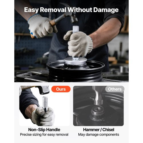 Robust och hållbar: Mejselverktyget är tillverkat av höghård aluminiumlegering. Förtjockade skivhylsor tål kraftiga slag från hammare eller mejslar. Vår bussningsmejselsats har en oxiderad svart beläggning för rost- och slitstyrka samt hållbarhet.