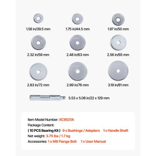 Omfattande storlekar: Vårt lagerpresskit hanterar lagerdemonteringsuppgifter i olika storlekar. Det är utrustat med 10 vanliga skivhylsstorlekar och flera monteringstillbehör för kompletta verktyg.