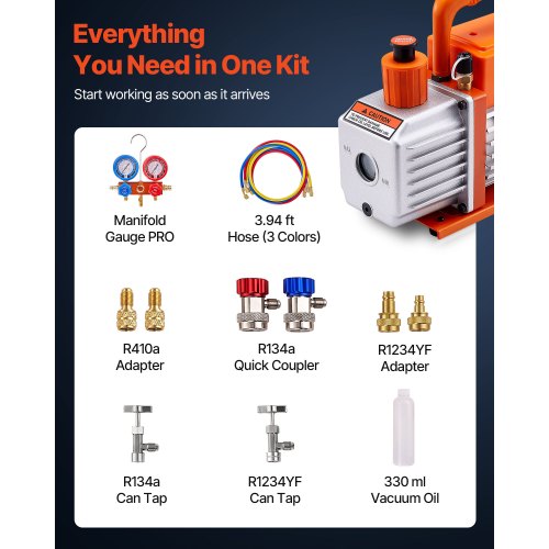 Allt du behöver: Detta kit innehåller en vakuumpump, manometersats för grenrör, trefärgad slang, R410a-adapter, R134a-snabbkopplingar, R1234YF-adaptrar, två kranar (för R134a och R1234YF), en flaska med 0,35 qt (330 ml) vakuumolja och en bärväska.