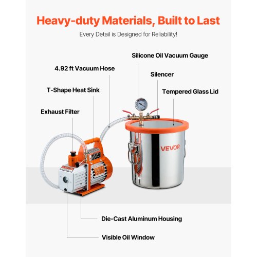 Alles, was Sie brauchen: Dieses Set enthält eine Vakuumpumpe, eine 11,36 Liter große Vakuumkammer, einen Deckel aus gehärtetem Glas, ein Vakuummeter, ein rotes und blaues manuelles Absperrventil, einen 1,4 Meter langen Schlauch, ein Silikonpad und eine 330 ml Flasche Vakuumpumpenöl.