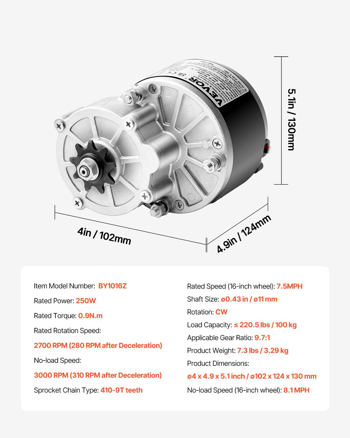 Hohe Leistung, effiziente Performance: Der leistungsstarke Gleichstrommotor von VEVOR liefert 250 W Ausgangsleistung und arbeitet effizient mit einem Umwandlungswirkungsgrad von ≥78 %. Dies gewährleistet zuverlässige Geschwindigkeit auch in schwierigem Gelände und einen geringeren Energieverbrauch. Perfekt für Elektrofahrräder, Roller und andere DIY-Elektrofahrzeugprojekte, die hohe Leistung erfordern.