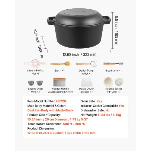 gjutjärnsgryta, 2-i-1-gryta med stekpanna och lock, 4,7 l kokkärl med jäskorg, tillbehör till brödbakning, kompatibel med brödugn 260 ℃ | EU