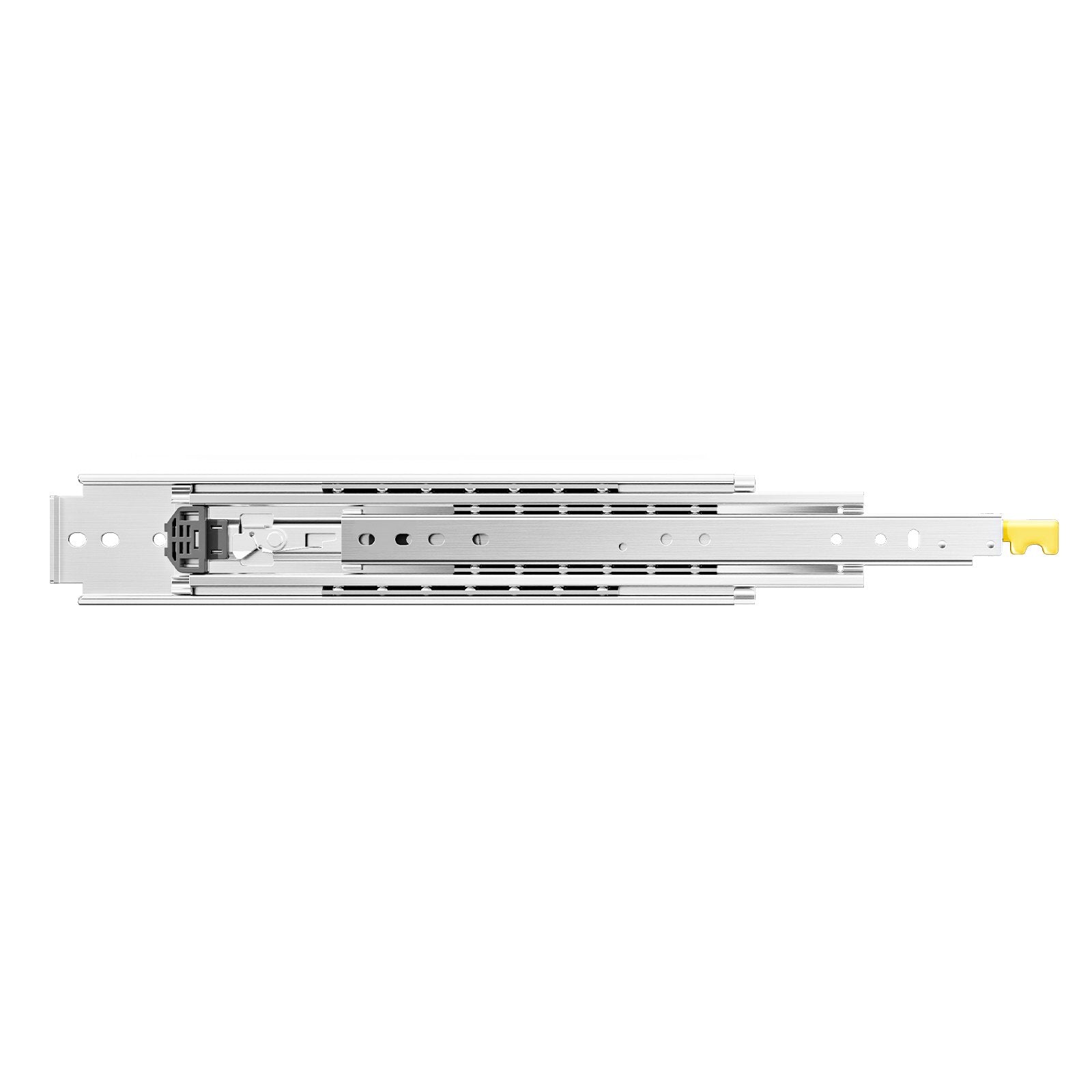 Leichtgängige und leise Verriegelungsschienen: Diese Schienen verfügen über ein leicht zu bedienendes Verriegelungs- und Arretierungsdesign. Im Gegensatz zu Schienen ohne oder mit nur einer Verriegelung bietet unser Doppelverriegelungsdesign mehr Sicherheit und Stabilität. Zweireihige Kugellager sorgen für sanftes Gleiten beim Schließen und Öffnen der Schubladen. Die Nylonpolsterung der mittleren Schiene sorgt für weniger Geräuschentwicklung und verhindert ein Nachwippen.