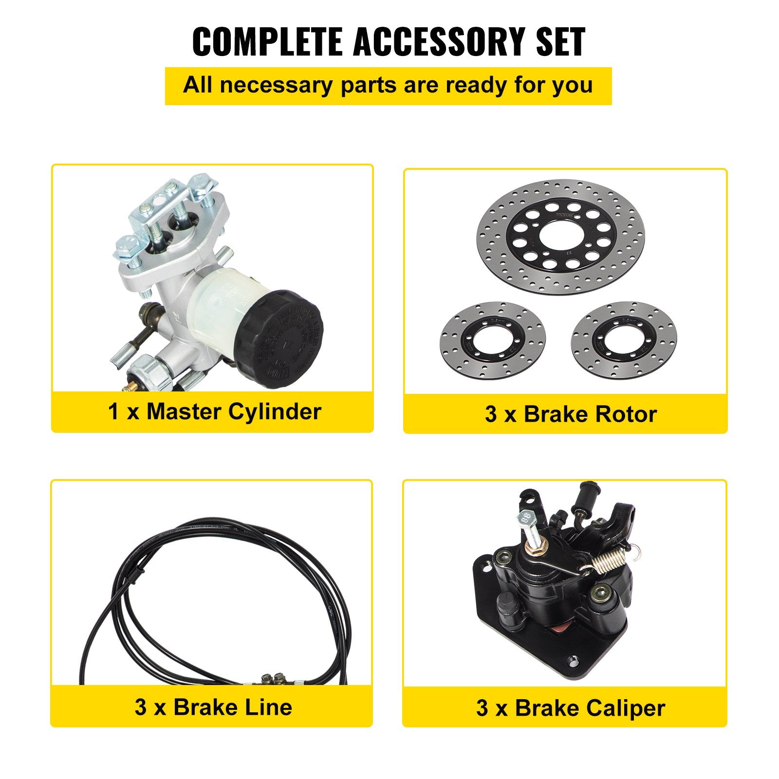 Complete accessories: The go-kart's hydraulic brake unit includes a master cylinder, three calipers, three brake hoses and brand new brake discs. It comes ready to install, pressurized with brake fluid. Don't worry about bleeding the brakes.