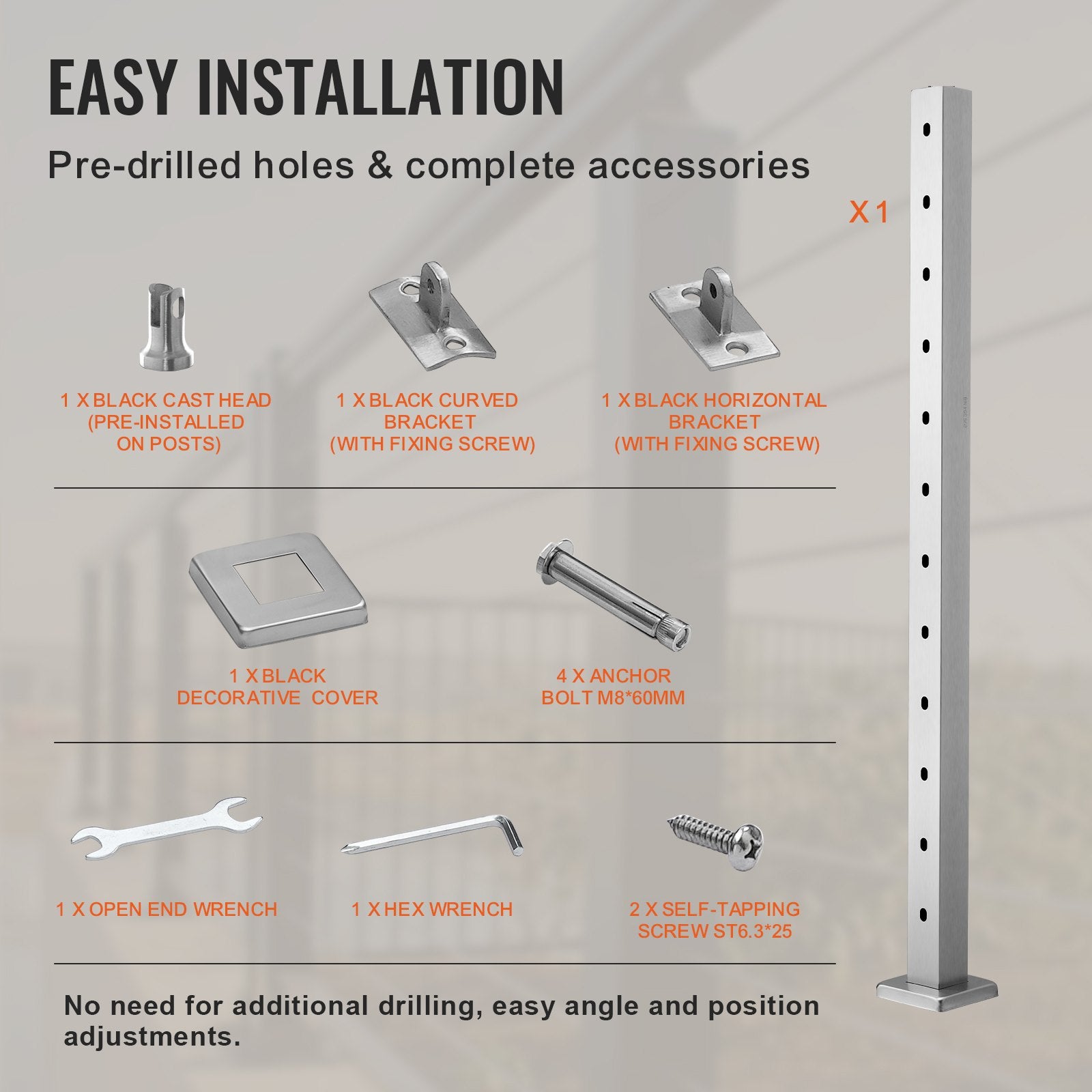 Easy to install and DIY: Our cable rail post is equipped with horizontal brackets and curved brackets, which fit different hole types in railing posts, compatible with square and round rail styles, allowing DIY customization of any handrail angle.