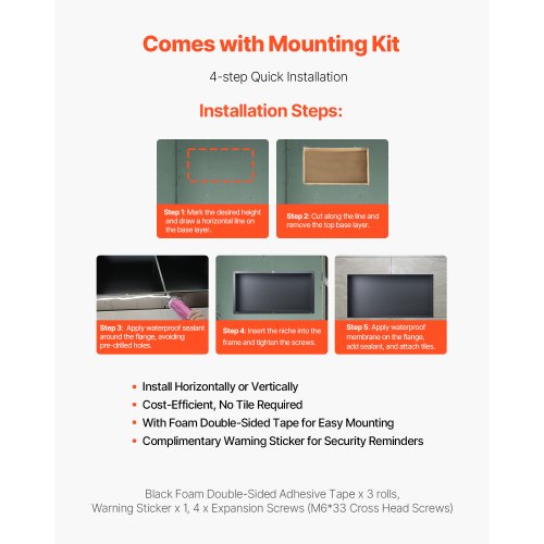 Easy Installation: Includes a roll of double-sided foam tape and extra warning stickers for easier installation. Just follow these steps: Step 1: Determine the desired height and draw a horizontal line on the base layer. Step 2: Cut along the line and remove the top base layer. Step 3: Attach the niche to the joists with waterproof sealant. Step 4: Seal the joints with waterproof sealant.