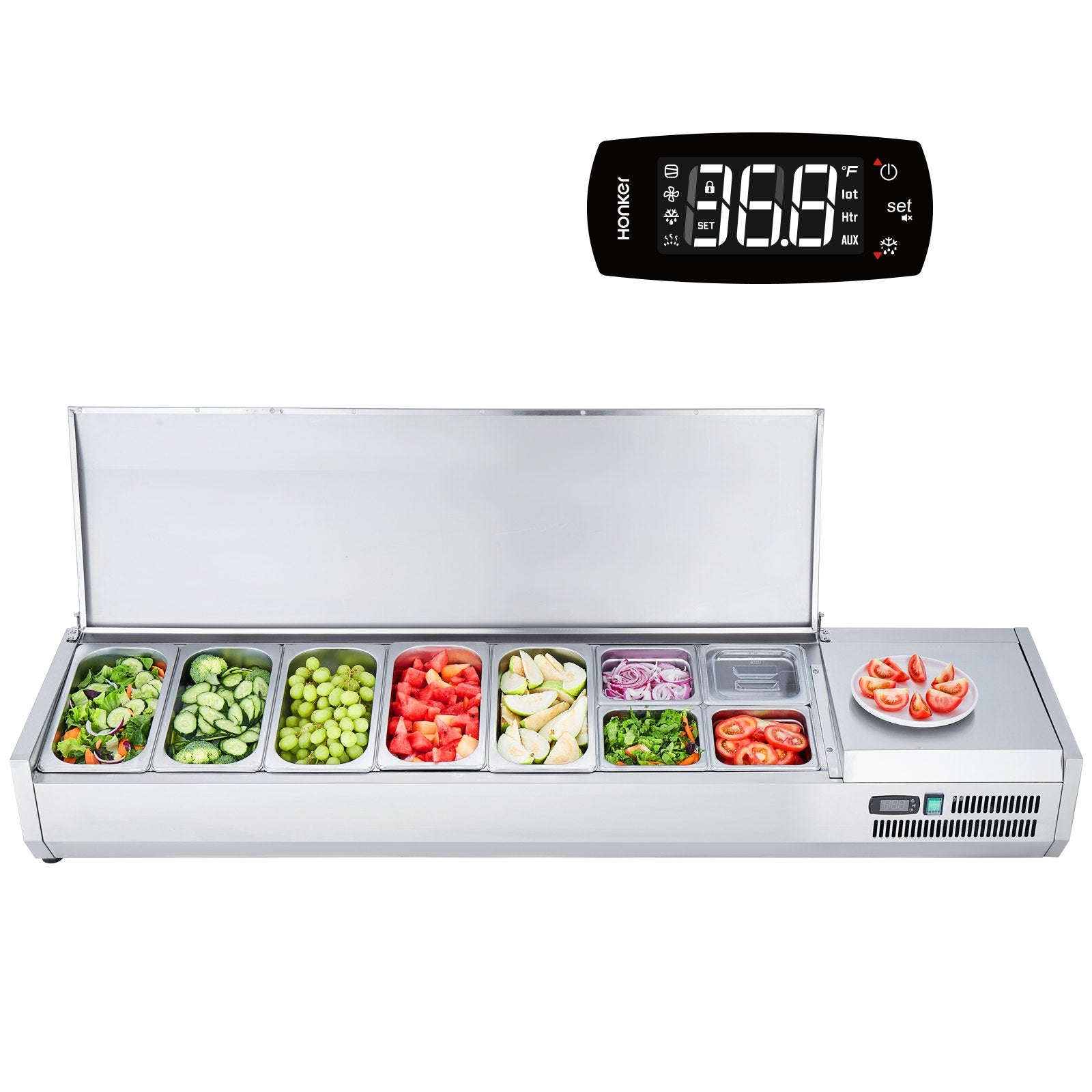 Modular Tray System: Our refrigerated seasoning station has 5 1/3 pans and 4 1/6 pans, increasing the capacity for flexible use. Removable dividers help you reasonably separate the areas to prevent flavor transfer and keep ingredients fresh. Made of 304 stainless steel and includes PC material containers with sealing lids to prevent dust and insects. Safe and reliable, you can also choose different sizes of pans as needed to meet your different requirements for food storage and display.