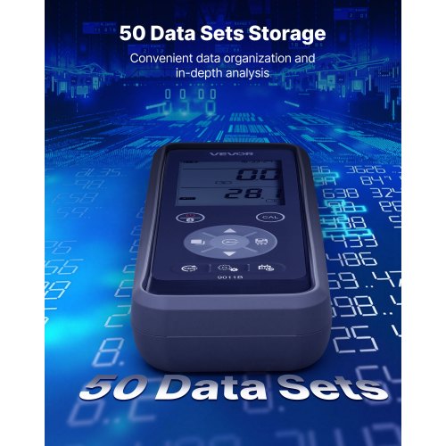 Praktiska funktioner: Vår syremätare för damm lagrar upp till 750 dataset med enkel återställning. Batterivarning och automatisk avstängning förlänger batteritiden. Den lutande designen möjliggör användning på skrivbordet. Ljudåterkopplingsknappar säkerställer en responsiv och intuitiv upplevelse.