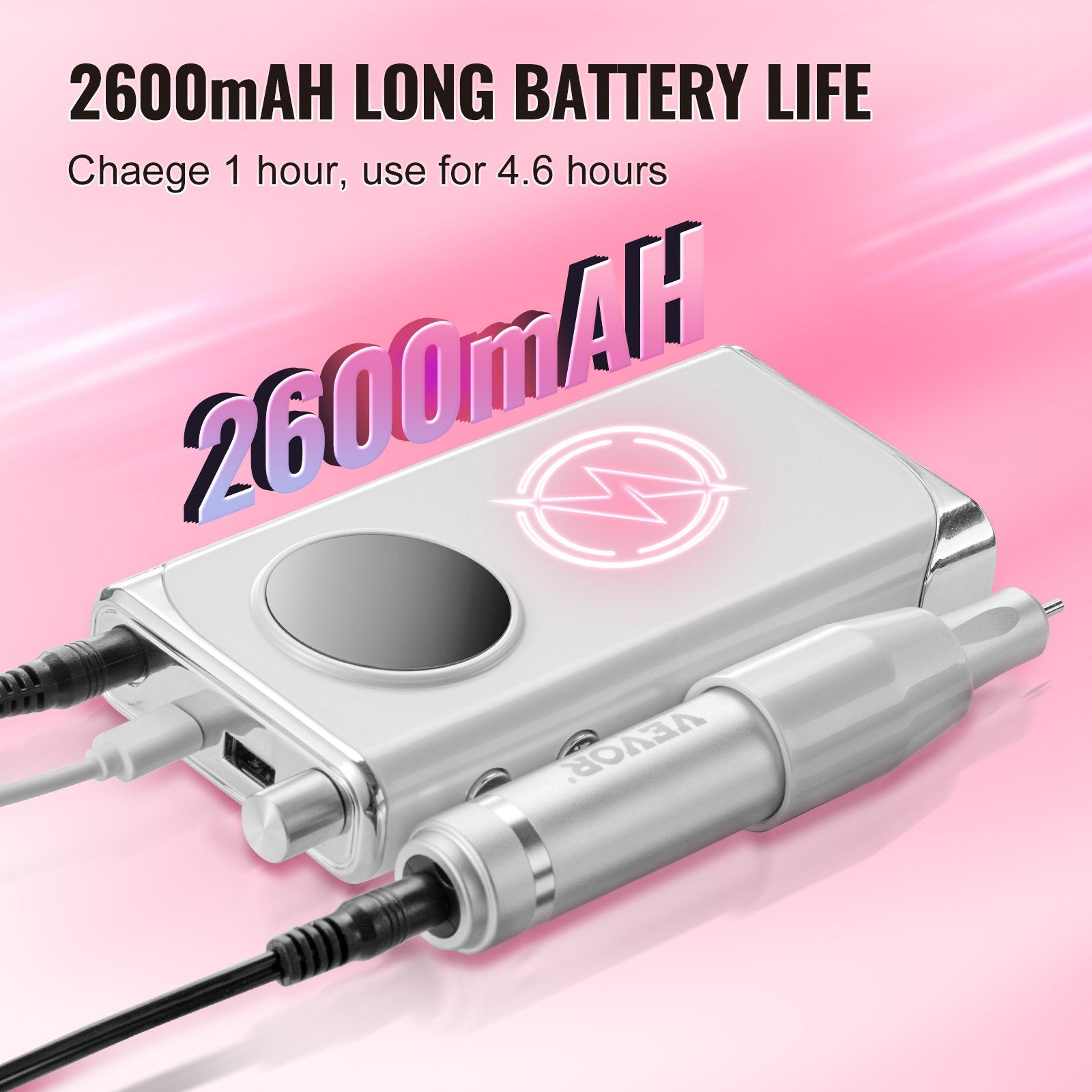 Charge Less, Do More: With a high-capacity battery of up to 2600mAh, this rechargeable cordless e-file can work continuously for up to 4.6 hours on a single charge, eliminating the hassle of frequent charging. Its cordless and portable design allows you to do your nails anytime, anywhere, without being tethered by cords.