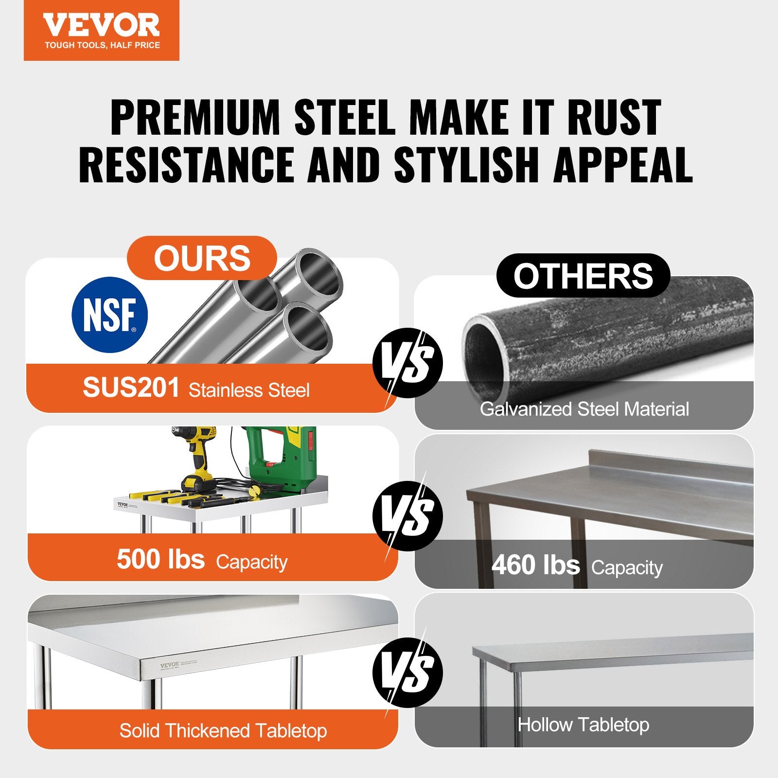 High-quality stainless steel: This workbench, measuring 24 x 15 x 40 inches, is made of SUS201 stainless steel for the tabletop, shelves and legs. It offers superior rust resistance, an elegant appearance and a smooth surface that is easy to clean with a simple wipe. NSF certified, it meets strict public health standards, ensuring long-lasting protection for your health.