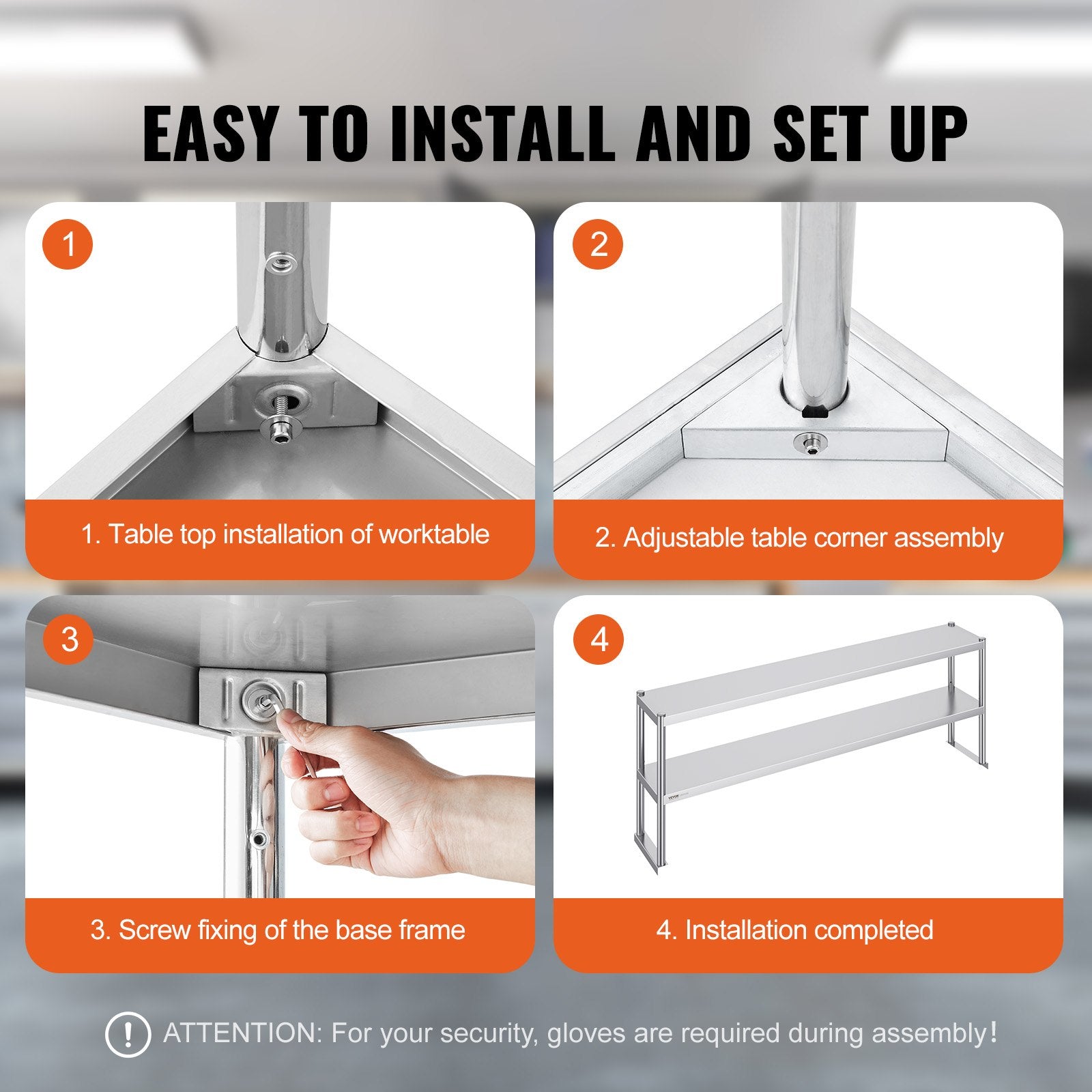 High-quality stainless steel: This workbench, solid bottom to top size: 12 x 72 x 24 inches, max overall size: 12 x 72 x 25 inches, is made of SUS201 stainless steel for table top, shelves and legs. It offers superior rust resistance, an elegant appearance and a smooth surface that is easy to clean with a simple wipe. NSF certified, it meets strict public health standards, ensuring long-lasting protection for your health.