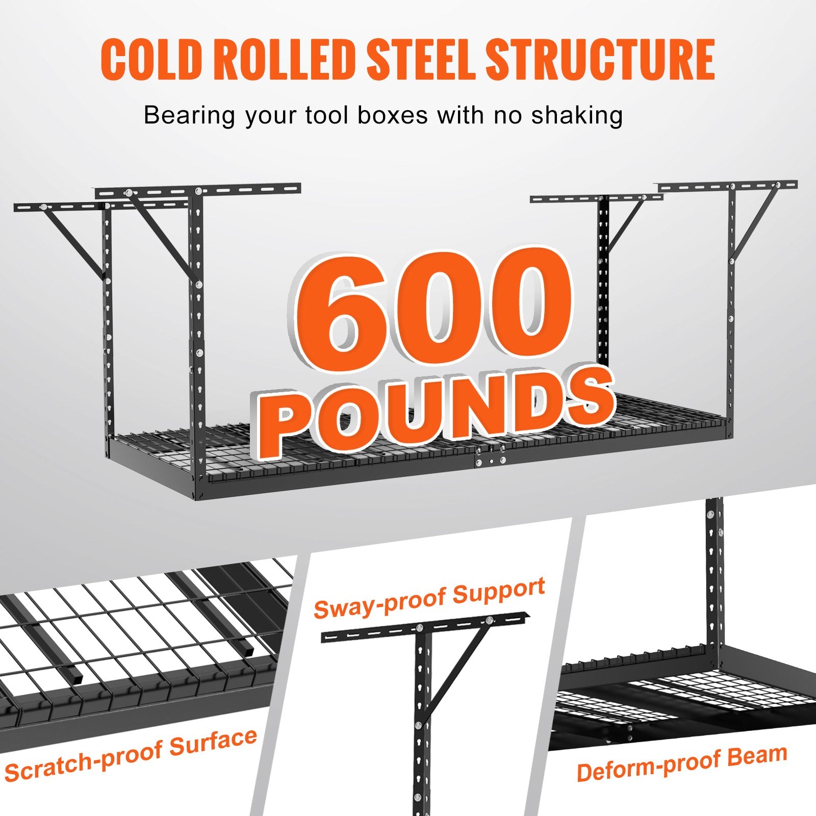 Solid Frame, Fine Performance: Our garage rack is made of heavy-duty cold-rolled steel with 2mm thick long beams, which provides a max. 600 lbs load capacity. The powder-coated surface provides an elegant appearance and outstanding rust and scratch resistance. In addition, with upgraded diagonal braces and reinforced cross beams, this roof storage rack can effectively avoid shaking and deformation.