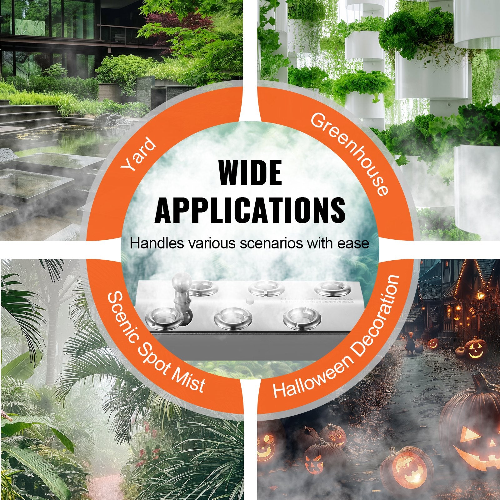 Waterproof Grade IP68, IP67: The 6-head ultrasonic fogger is made of 304 stainless steel and PP, with high strength, corrosion resistance and anti-scaling properties for durability. With an IP68 waterproof rating for the fogger and an IP67 waterproof rating for the power supply, it ensures long-term operation in humid and dusty environments.