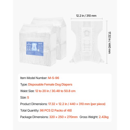 Super Absorbent: VEVOR disposable female diapers in size S have a super absorbent core that quickly locks in liquid and offers 360° leak-proof protection without backflow. Perfect for dogs in running cycles, pet training, incontinence, post-surgery recovery and travel. Suitable waist size: 12-20 inches / 30.48 - 50.8 cm